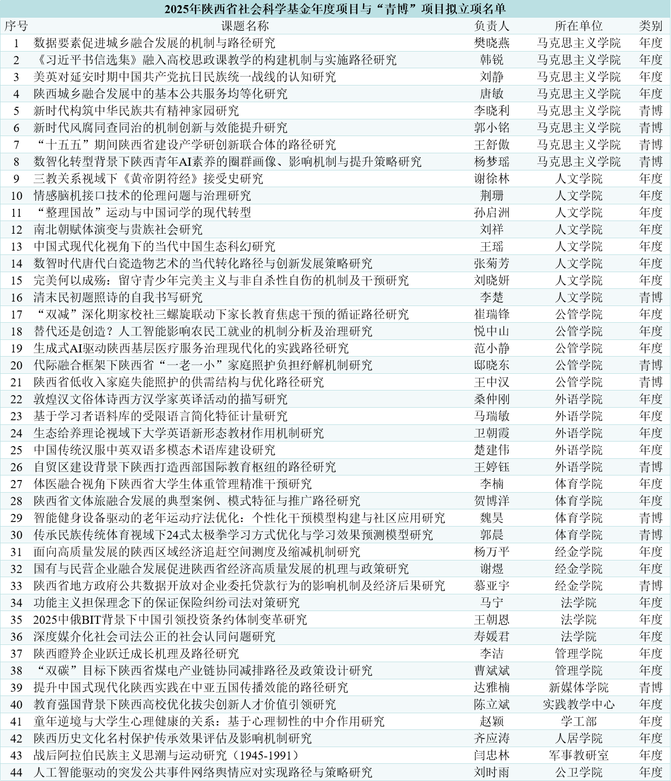 9月28日,陕西省哲学社会科学工作办公室公示了2025年陕西省社会科学基金年度项目和“青博”项目立项名单,我校共44个项目入选,包括年度项目32项,“青博”项目12项,立项率达37%,创历史新高。